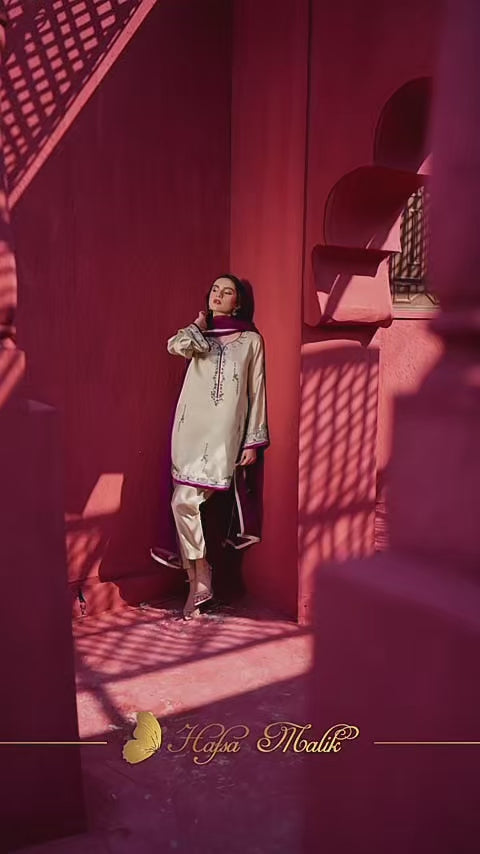 Citrus is a refreshing pastel green short kurti adorned with intricate same-color embroidery, creating a subtle yet elegant look. Paired with a perfectly tailored tapered shalwar and a rich plum contrast dupatta, this ensemble is a beautiful blend of grace and sophistication