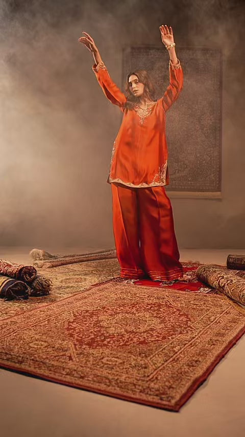 Veronica is a rust-toned shisha silk dress featuring a beautifully structured cutline, adorned with exquisite hand-worked zardozi embroidery infused with silk detailing. The ensemble is paired with wide-bottom pants, finished with delicate embellishments along the hems.