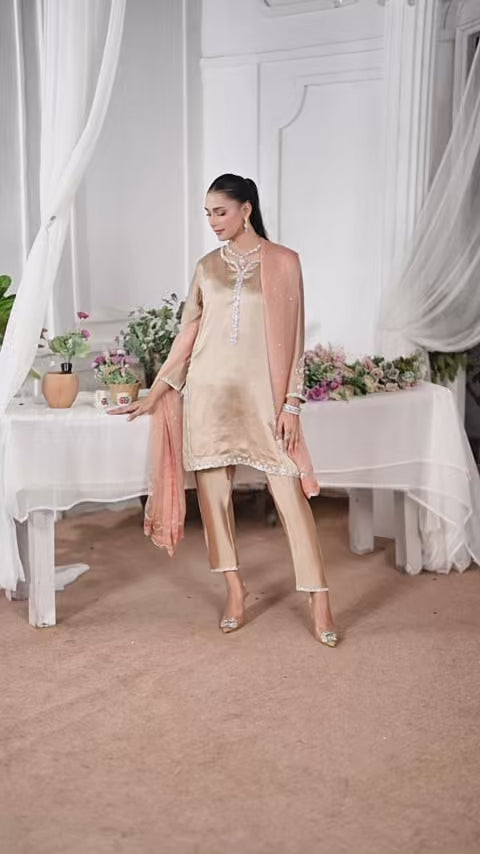 Celine — a short shisha silk shirt adorned with intricate hand-worked detailing, paired with elegantly tailored tapered pants. Finished with a delicately hand-embellished organza dupatta, this ensemble blends timeless craftsmanship with modern sophistication.
