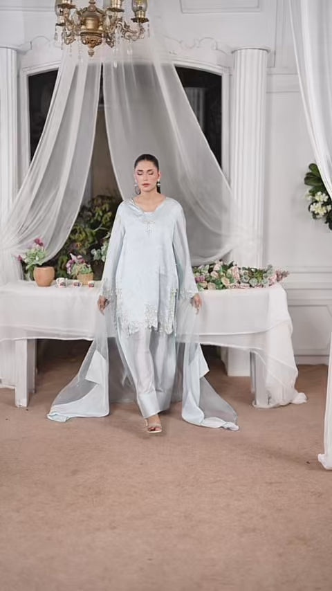 Multi — a short ice-blue shirt adorned with exquisite stonework, paired with a graceful farshi shalwar. Finished with a sheer organza dupatta, this ensemble captures timeless elegance with a refined, contemporary feel